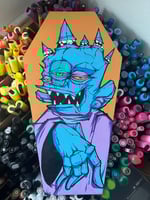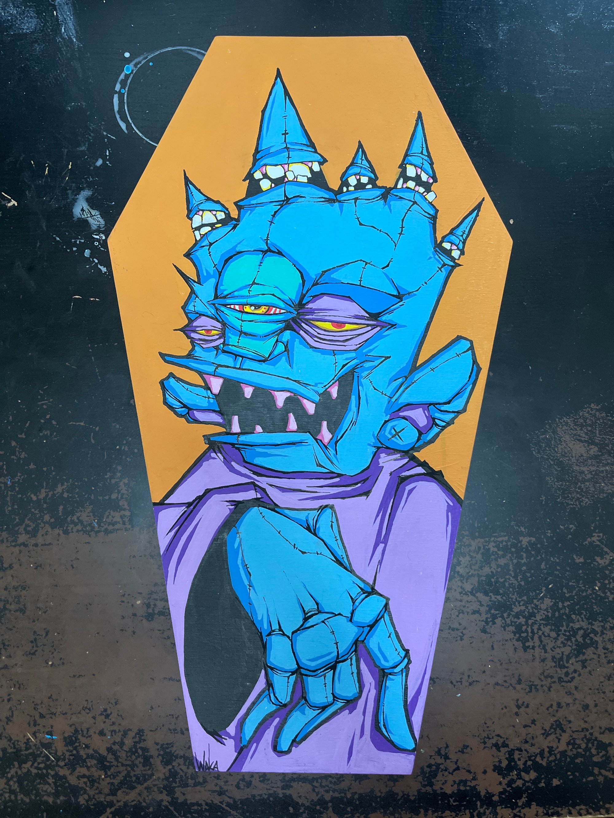 Hand painted character on 228 coffin cut wood panel